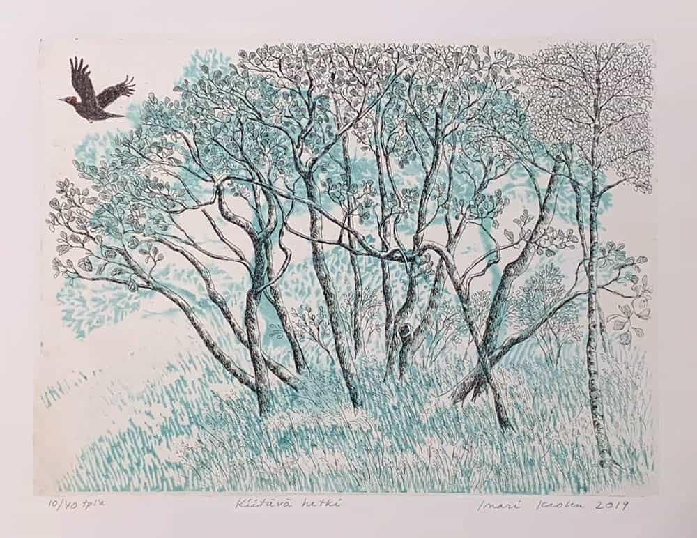 Inari Krohn, Kiitävä hetki, etsaus, puupiirros ja vesiväri, 2019