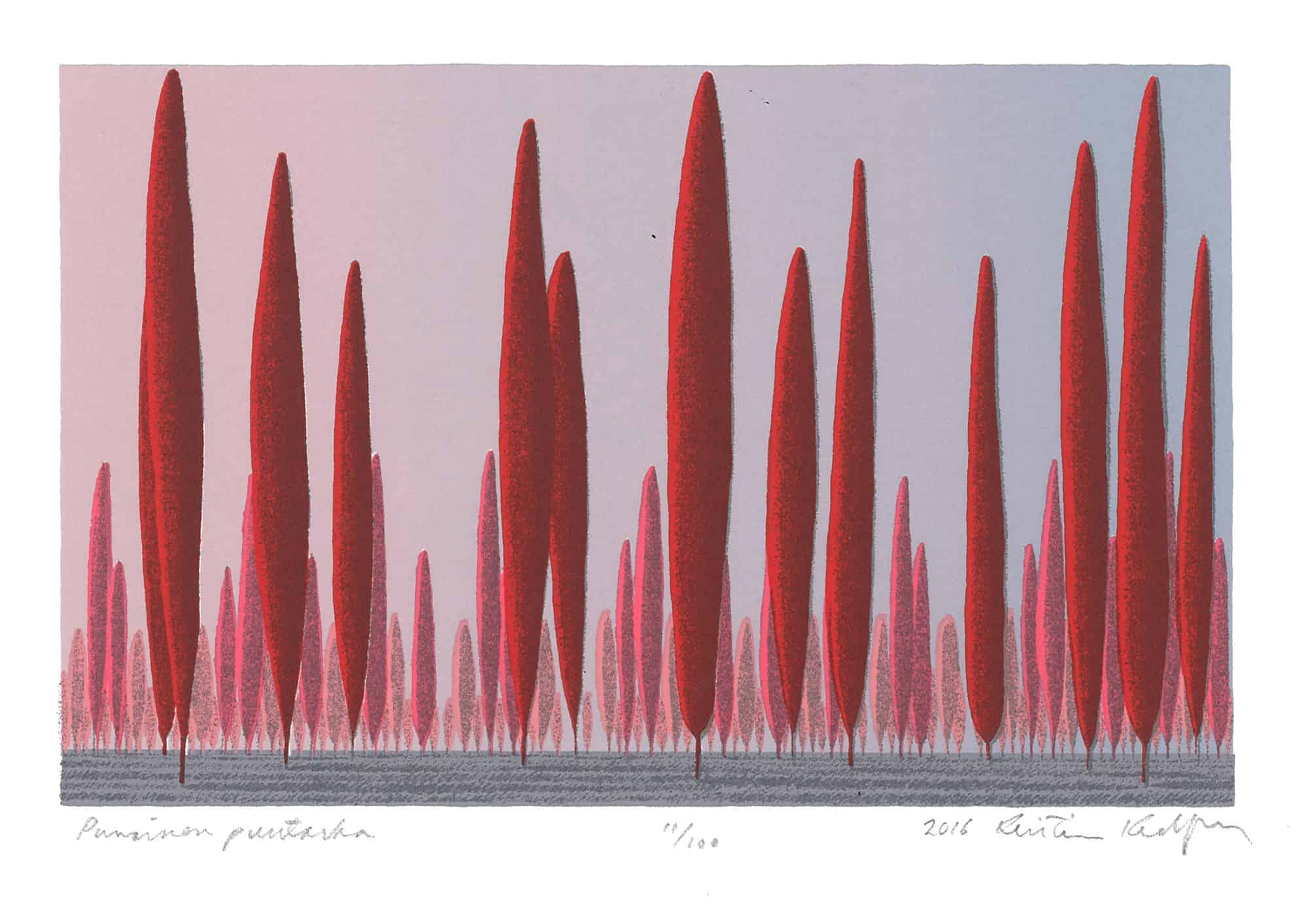 Kristian Krokfors, Punainen puutarha, serigrafia, 2016