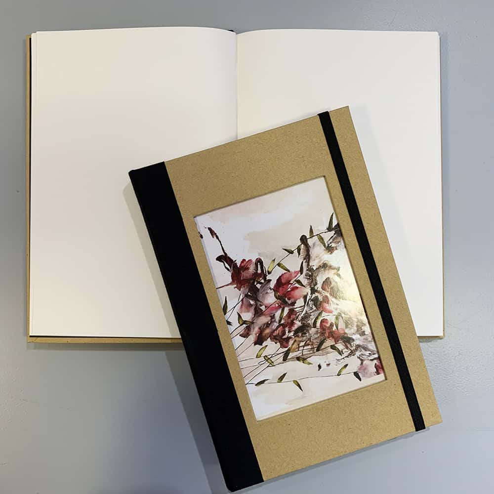 Muistikirja valokuva/postikortti kannella. Valkoiset sisäsivut.