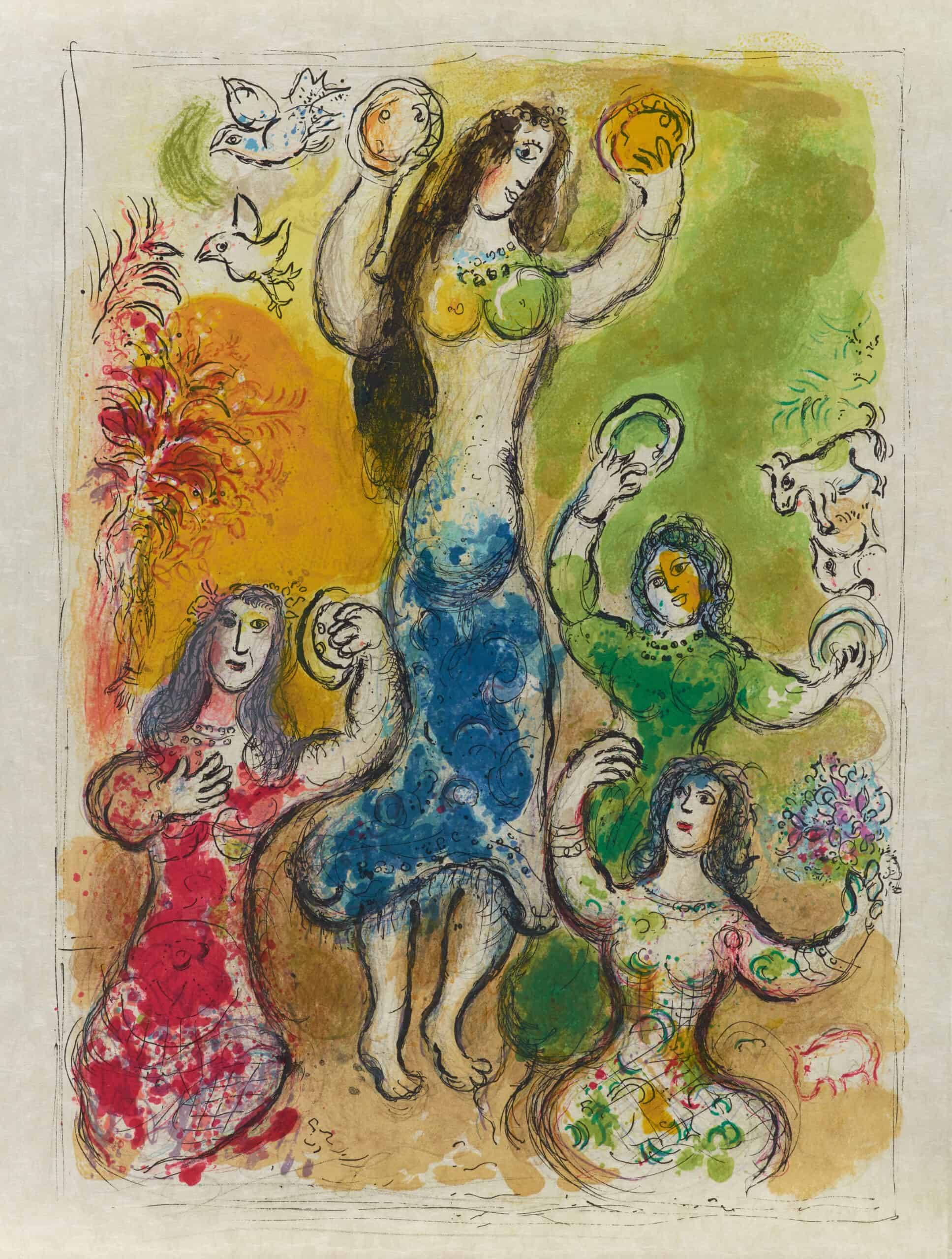 Marc Chagall: Ja naisprofeetta Mirjam, Aaronin sisar, otti vaskirummun käteensä, ja kaikki naiset seurasivat häntä vaskirumpuja lyöden ja karkeloiden. M. 454