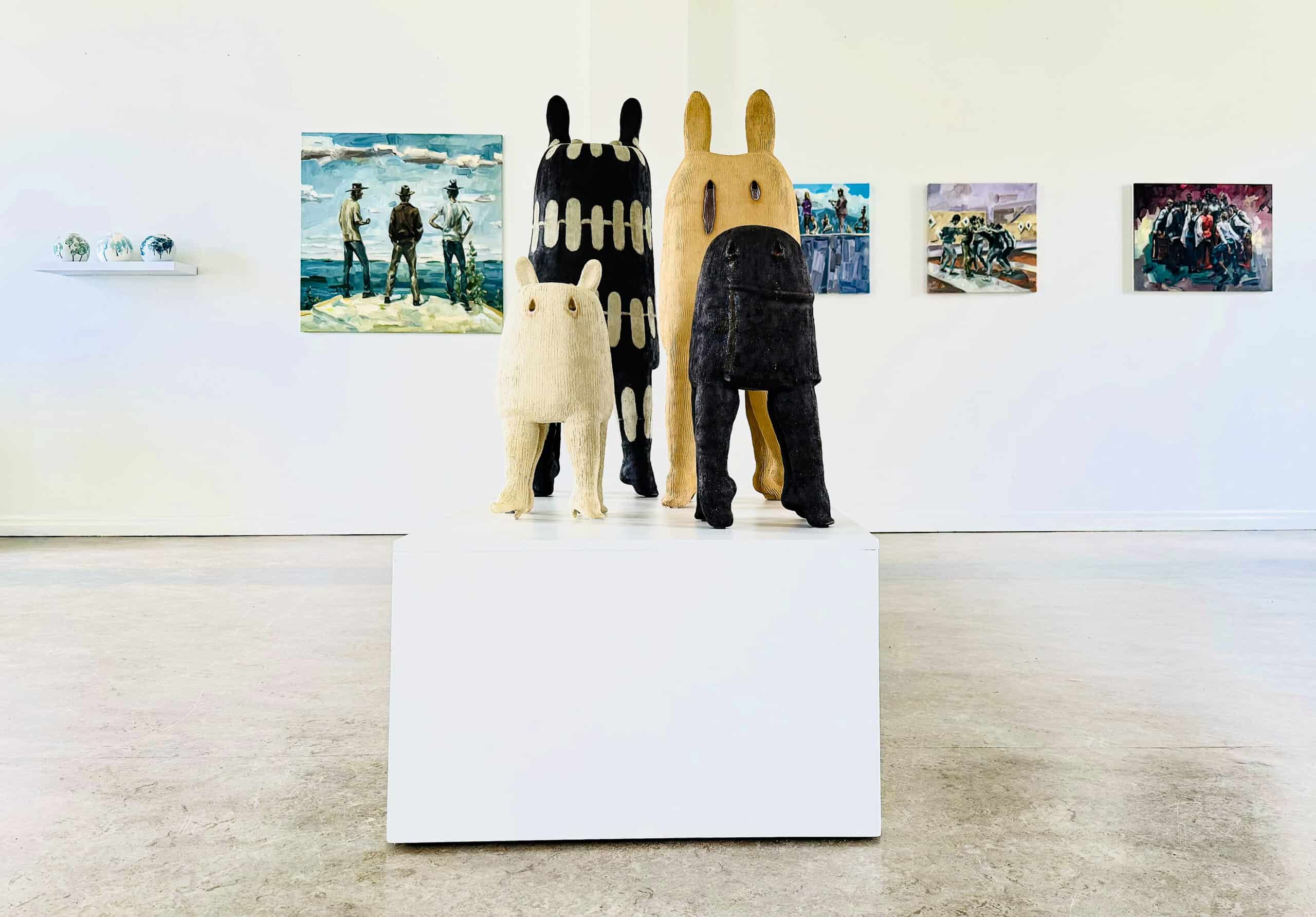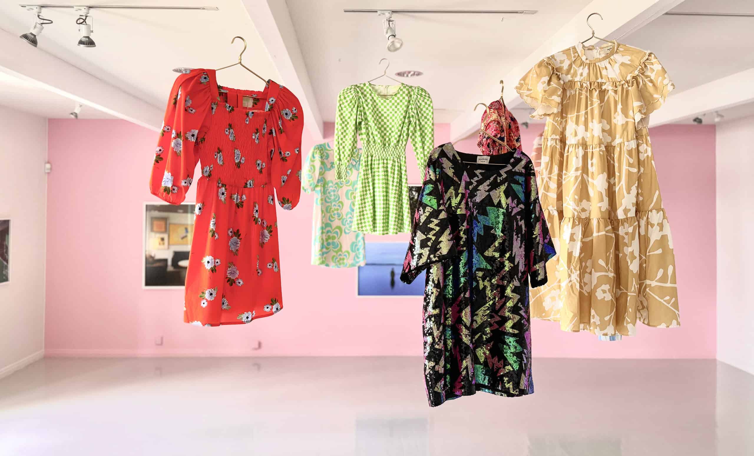 Elina Brotheruksen näyttelysali 2024, esillä myös Ivana Helsingin mekkoja. Brotherus on käyttänyt kuvissaan Ivana Helsingin vaatteita.