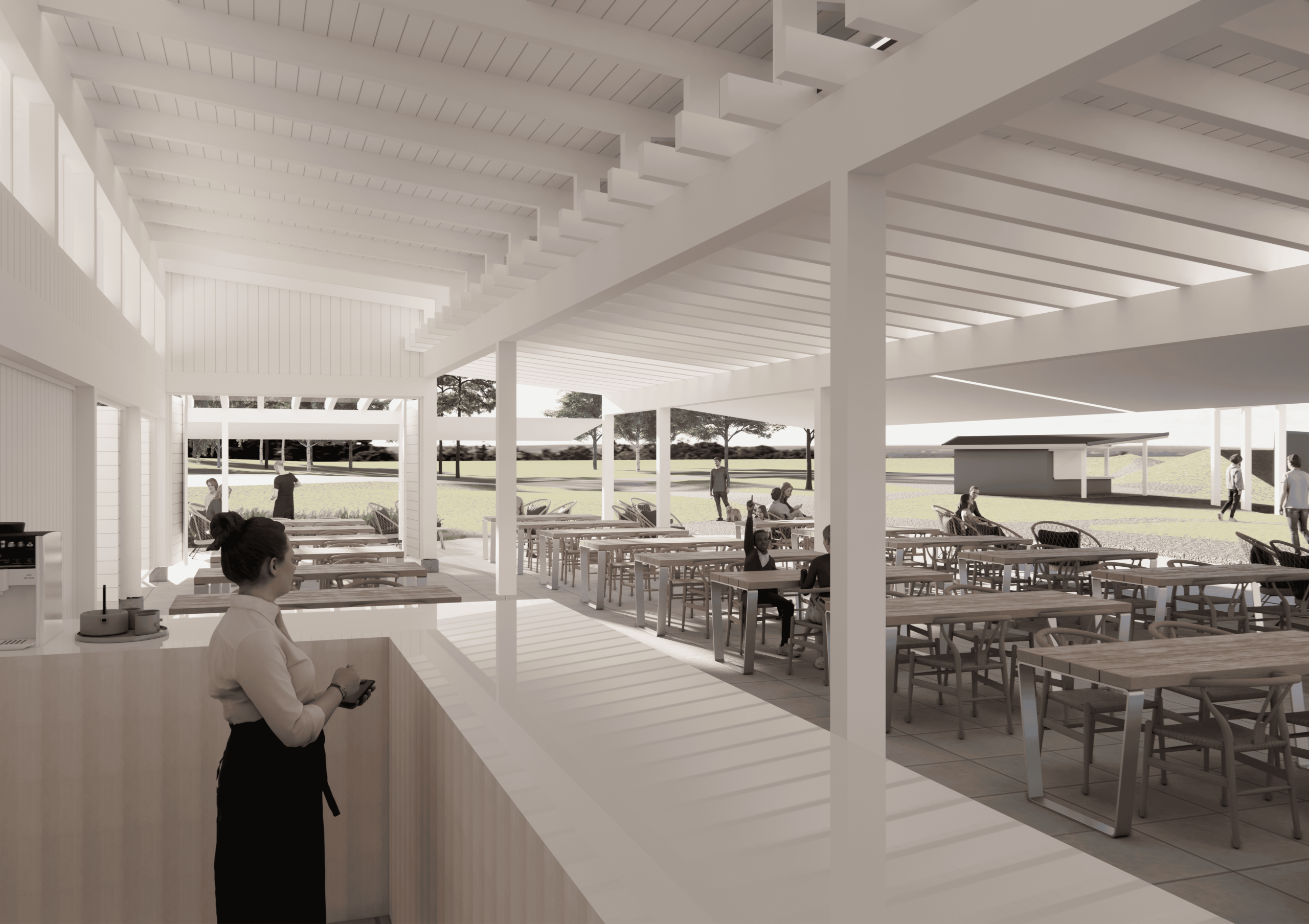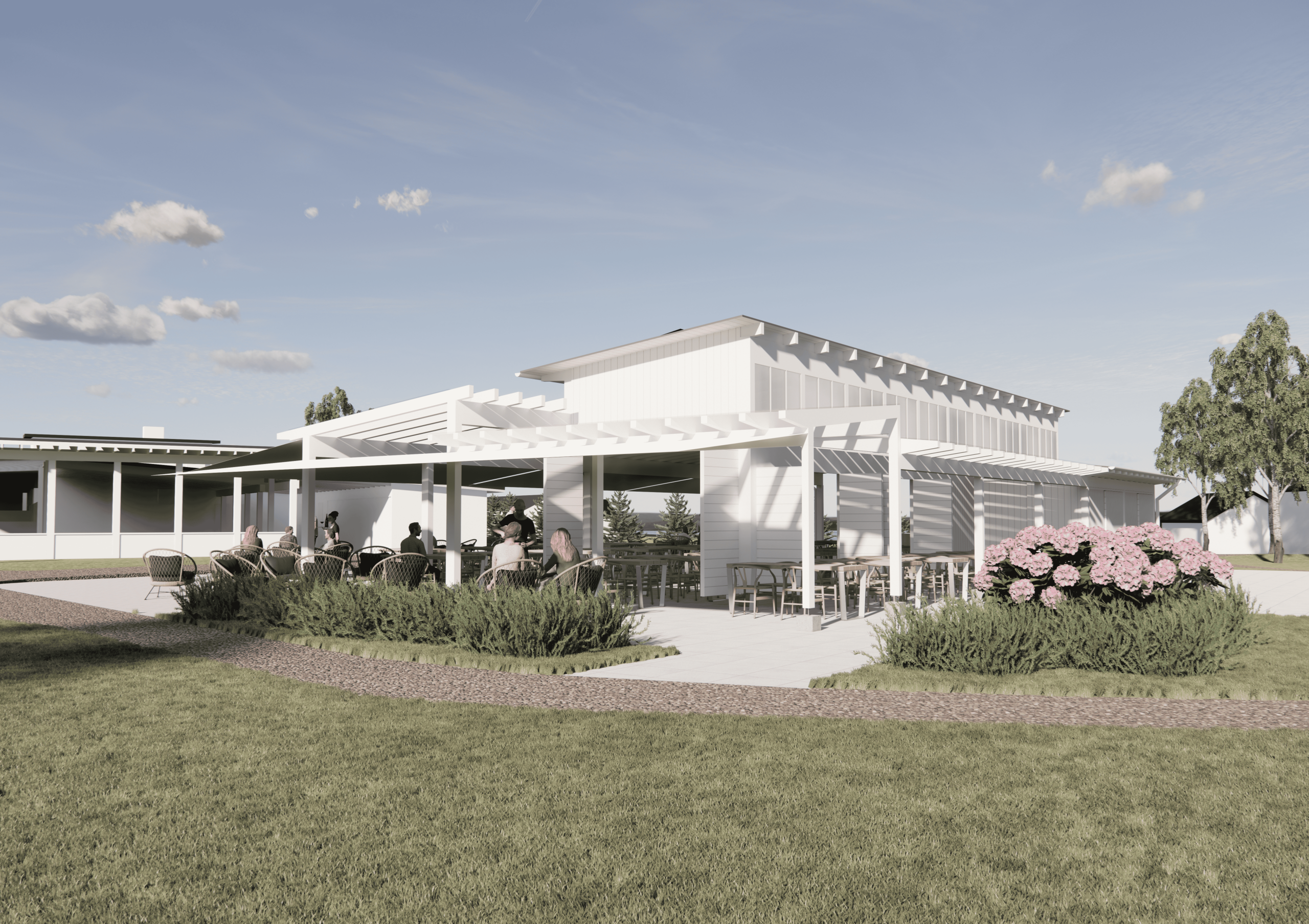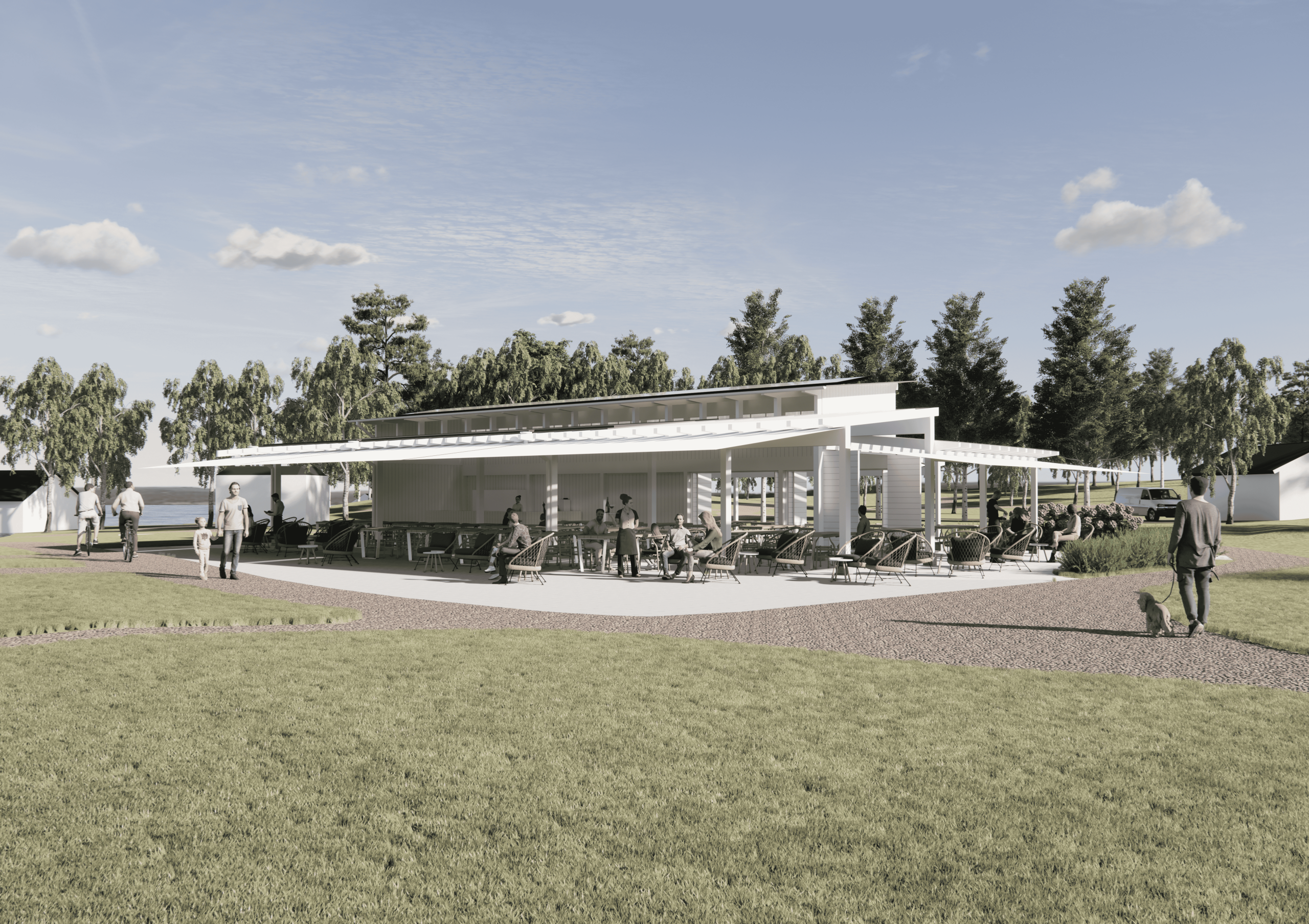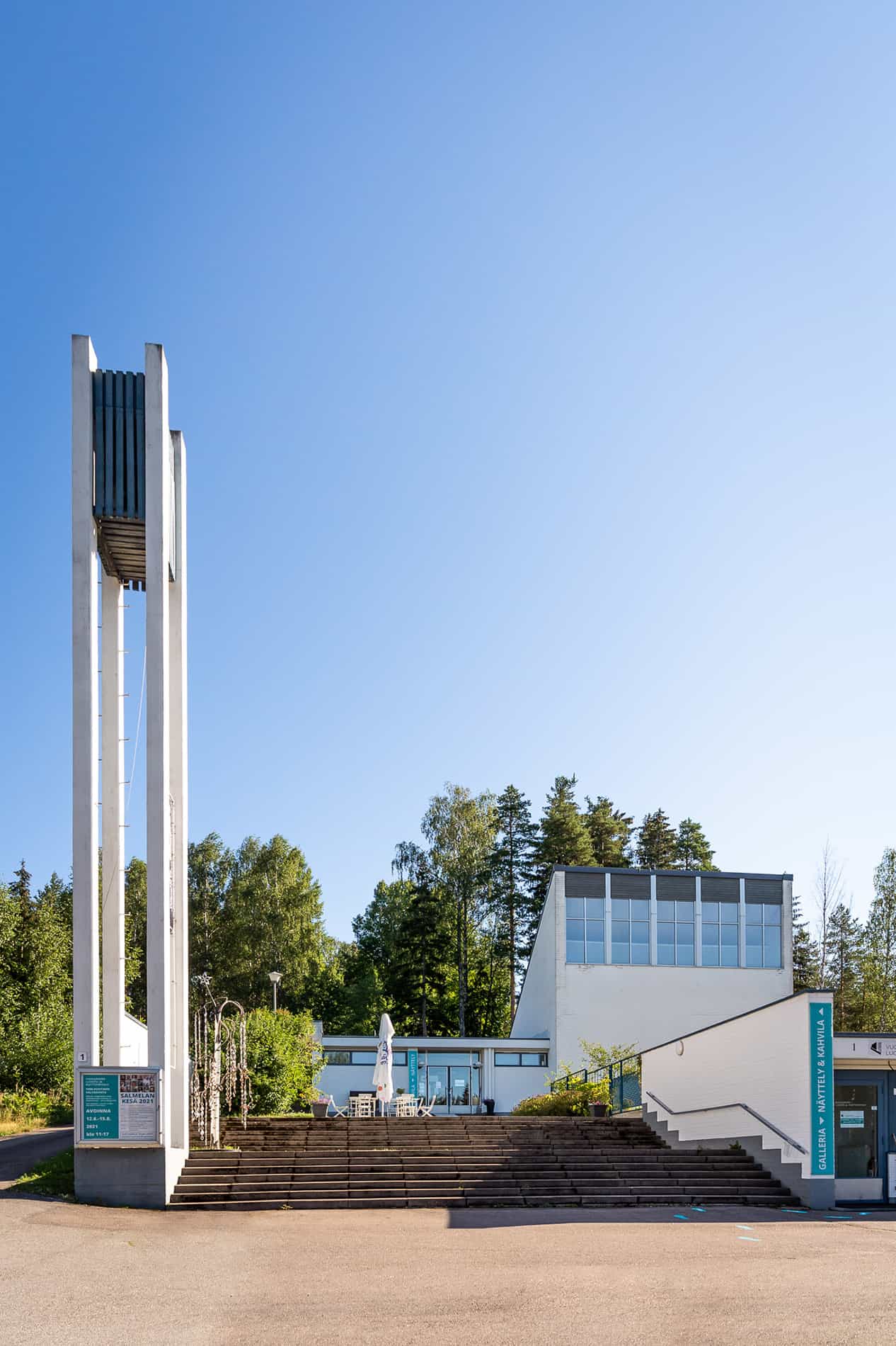 Vaaleanpunainen, funkkistyylinen Kahvila Kesäheinä terasseineen tarjoaa levähdyspaikan näyttelyvieraille.