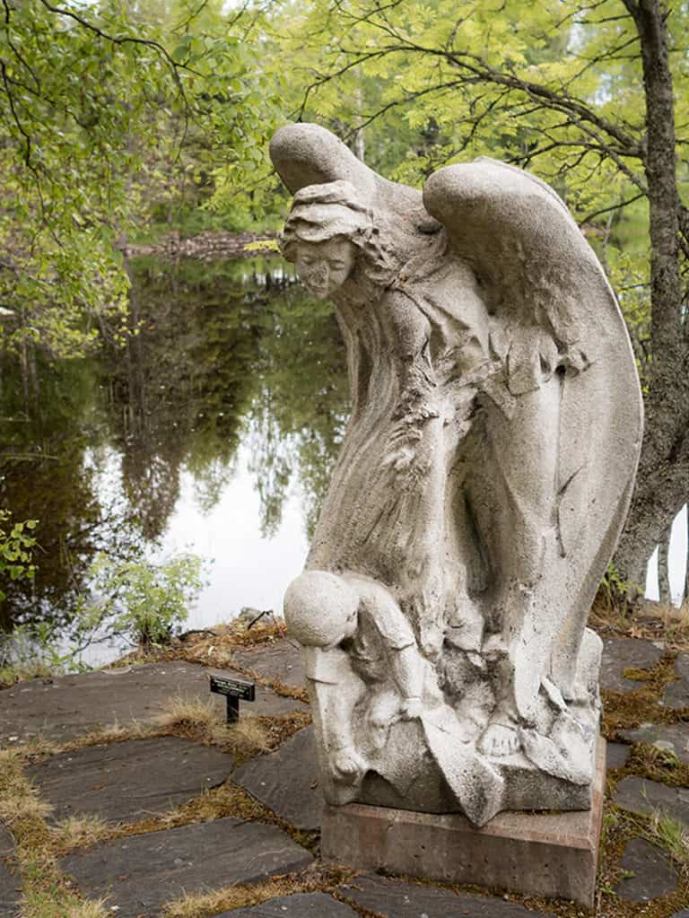 Domanderin rannassa sijaitseva Georges Winterin (1875-1954) enkeliveistos on tuotu Suomeen Viipurista. Enkelin otsan on sanottu tuovan onnea ja siunausta kaikille sitä koskettaville. Kuvaaja Jenni Höök.